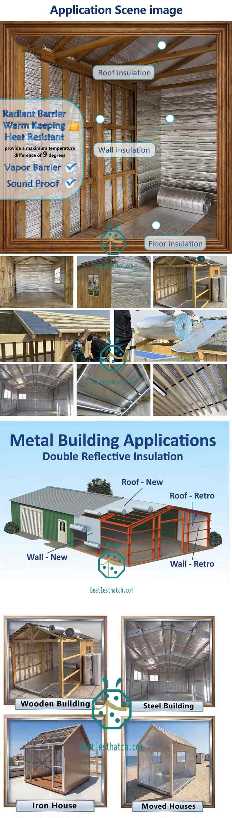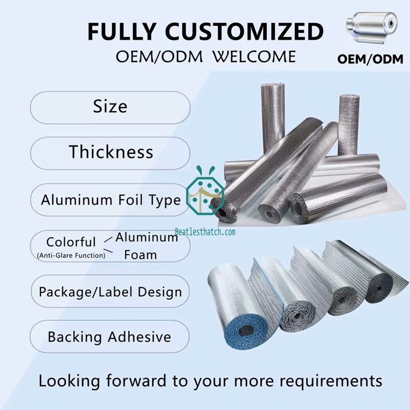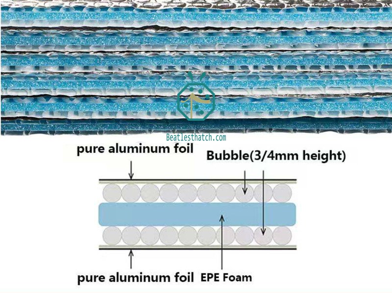 Hochleistungsfähige, 10 mm starke, feuerhemmende Aluminiumfolienisolierung. Mit doppelter Luftpolsterfolie und EPE-Schaumstoffschichten. Ideal für Dächer tropischer Ferienanlagen und synthetische Reetdachziegel.