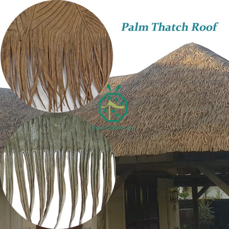 Unser synthetisches Palmenstrohdach verwendet nur neue Materialien für die Produktion, um eine lange Lebensdauer in rauer Umgebung zu gewährleisten. Künstliche Palmenstrohplatte ist wasserdicht für keine Sperrholz-Dachkonstruktionen, wenn 8-12 Stück für 1 Quadratmeter Dach verwendet werden.
