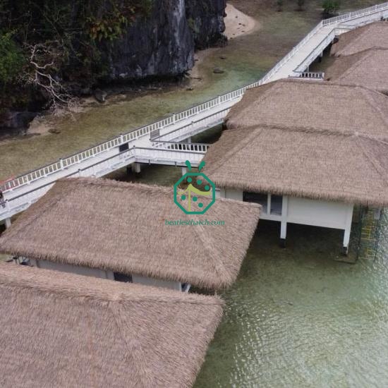 Zur Dekoration von Strohdächern an Bungalows über dem Wasser, Nylon-Reetdachziegel Nylon-Reetdachziegel sind äußerst kostengünstige Lösungen. Dank ihrer chemischen Zusammensetzung eignen sie sich hervorragend für den Einsatz in Strandgebieten. Das flauschige Aussehen eines Nylon-Reetdachs für Bungalows weckt das Interesse Ihrer Gäste und macht Ihr Resort-Hotel attraktiver. Gleichzeitig ist Nylon-Reet im Vergleich zu natürlichen Reetdachmaterialien sicherer, da es in den meisten Bereichen der Brandschutzprüfung nach UL 94-2013 die Klasse V0 erreicht. Aufgrund dieser Vorteile ist Nylon-Reetdach eine kostengünstige Lösung für die Gestaltung von Reetdach-Bungalows in Resort-Hotels.