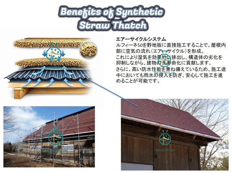 Unser autorisierter japanischer Händler hat in der Präfektur Yamagata erfolgreich ein Projekt zur Restaurierung denkmalgeschützter Gebäude abgeschlossen und dabei verrottetes und abgefallenes Naturstrohdach durch unser Premiumprodukt ersetzt. Dachziegel aus synthetischem Stroh Die
